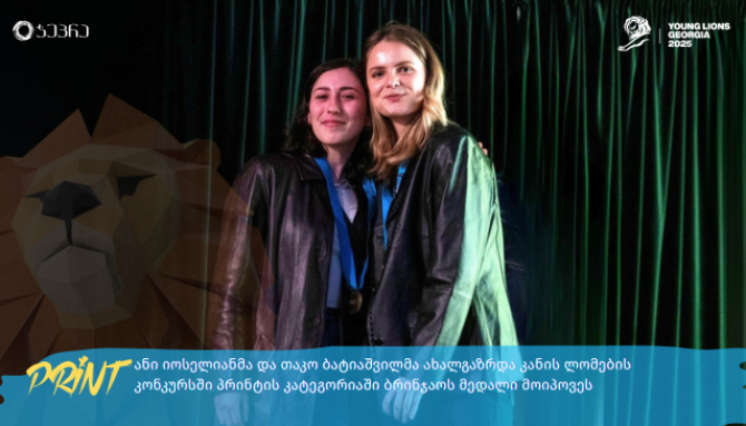 ანი იოსელიანმა და თაკო ბატიაშვილმა ახალგაზრდა კანის ლომების კონკურსში პრინტის კატეგორიაში ბრინჯაოს მედალი მოიპოვეს. ანი იოსელიანმა და თაკო ბატიაშვილმა ახალგაზრდა კანის ლომების კონკურსში პრინტის კატეგორიაში ბრინჯაოს მედალი მოიპოვეს.